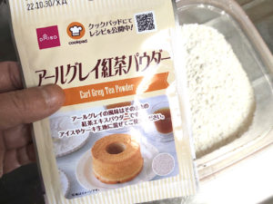 ![]() ⑤ボールに、薄力粉、ベーキングパウダー、アールグレイ紅茶パウダーを合わせてふるい入れましょう。 (ダイソーのパウダーを使いました。) |