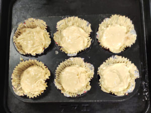 ![]() ⑧6個組のマフィンパンにカップケーキ用のホイルを乗せ、生地をスプーンで等分にすくい入れます。 |