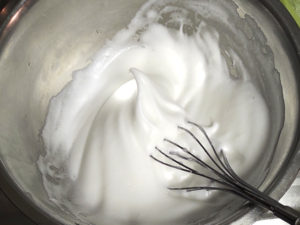 ①卵白に砂糖を一つまみ加えて泡立て始め、途中二回に分けて砂糖を加え、ピンと角が立つまで泡だててメレンゲを作りましょう。