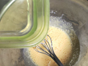 ⑦卵黄のボールに、メレンゲをひとすくい加え、良く混ぜます。