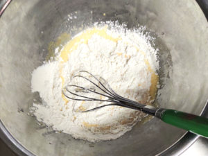 ⑥薄力粉と紅茶パウダーを合わせてふるい入れ、粉っぽさが消えるまで良く混ぜ合わせます。