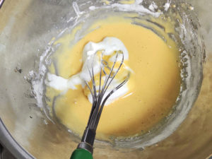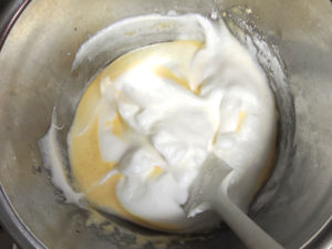 ⑧卵黄のボールにメレンゲを加え、ゴムべらに持ち替えて、さっくりと練らないように混ぜましょう。