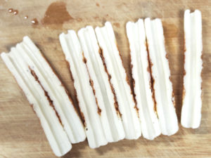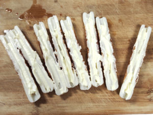 ②竹輪の溝の部分にマヨネーズを絞りましょう。