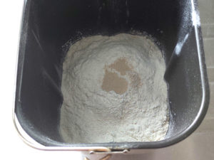 ![]() ①ホームベーカリーに、牛乳、グラニュー糖、マーガリン、強力粉の順に入れ、粉の中央をくぼませて、そこにドライイーストを乗せます。 |