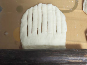 ![]() ⑦生地を6等分し、麺棒で長方形に伸ばしたら、半分はそのまま、もう半分にはスケッパーで切り込みを細目に入れます。 |