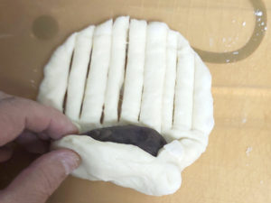 ![]() ⑧切り込みが入ってない部分に餡子を乗せ、くるくると巻いていきましょう。 (とじ目部分も指で閉じてください。) |