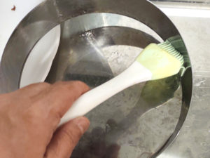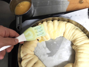 ![]() ⑨型の内側に沿ってパン生地を配置し、リング状になるようにします。 ⑩卵を溶き、刷毛で表面に塗りましょう。 |