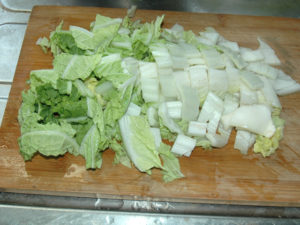 ![]() ①白菜は一旦縦に割ってから、幅5cmほどのざく切りにします。 |