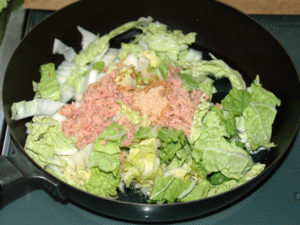 ![]() ②鍋に白菜、シーチキン、醤油、みりん、ほんだし、水を入れてさっとかき混ぜます。 |