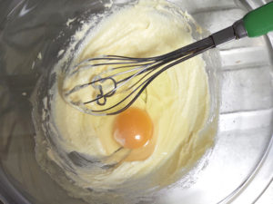 ②グラニュー糖を加え、白っぽくふわふわして、砂糖のザラザラ感が消えるまで混ぜましょう。