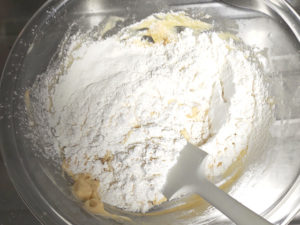 ⑥薄力粉とベーキングパウダーを合わせてふるい入れ、ゴムベラで練らないようにさっくりと混ぜます。