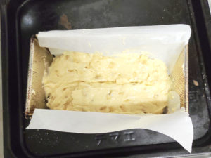 ⑦パウンドケーキ型にオーブンシートを敷き、生地をすくい入れたら、縦に筋をつけましょう。