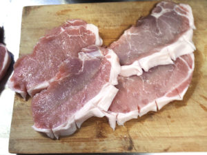 ![]() ①豚肉は、身と脂身の間に垂直に切り込みを入れます。 (筋きりすると、揚げても縮みにくくなります。) |