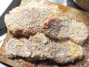 ![]() ②豚肉に、薄力粉→溶き卵→パン粉の順に衣をつけましょう。 |