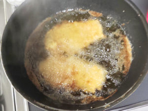 ![]() ③180度の油で、表面がきつね色になるまで揚げます。 (裏表で、3~4分ずつくらいが目安です。) |