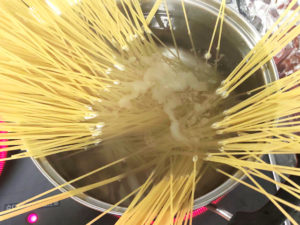 ![]() ④鍋にたっぷりのお湯を沸かし、沸いたら塩大1/2ほど(分量外)を加えて、パッケージの袋通りにパスタをゆでましょう。 |