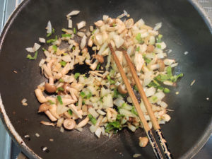![]() ⑤玉ねぎは皮をむいて粗みじん切りに、ピーマンは種とヘタを除いて粗みじん切りに、しめじは根元を切り落として3等分くらいの長さに切ります。 |