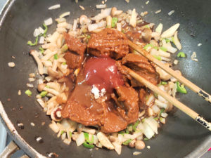 ![]() ⑧野菜を炒めたら、ドミグラスソース、砂糖、ウスターソース、ケチャップを加えて混ぜ、ソースを作ります。 |