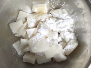 ②冷凍イカの水分をペーパータオルなどで拭き取り、片栗粉を全体にまぶしましょう。