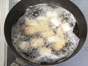 ③フライパンに高さ1~2cmほどにサラダ油(分量外)を張り、イカを1分半ほど揚げて取り出し、油きりをしておきます。