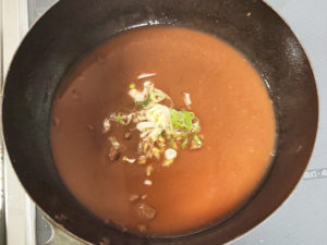 ⑤調味料が溶けたら、ねぎ、生姜、にんにくを加えて、弱火にかけます。