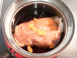 ![]() ②鶏肉がすっぽり入るくらいの大きさの鍋に、鶏肉、生姜(チューブでも可)、水、砂糖、みりん、カンタン酢、醤油を入れて火にかけます。 |