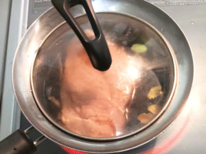 ![]() ④皮目を下にして、さらに2分弱火で煮て、再びひっくり返して弱火で2分煮込み、粗熱を取ります。 |