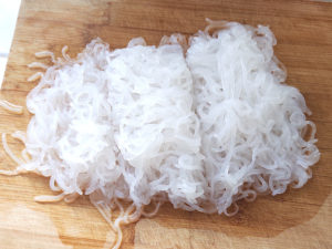 ![]() ①白滝は3等分の長さに切って、軽く水切りをします。 |
