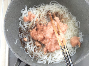 ![]() ④お湯切りをした白滝、身を取り出したたらこ、砂糖、みりん、醤油、めんつゆを加えて全体を混ぜましょう。 ⑤混ぜながら炒め、たらこが完全に白くなったらOK。 |