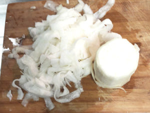 ![]() ②大根は皮をむき、ピーラーでひらひらに切りましょう。 |