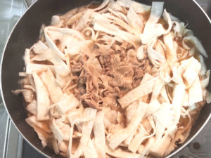 ![]() ③鍋の中央にほぐした豚こまを入れ、周りを大根で敷き詰めます。 |