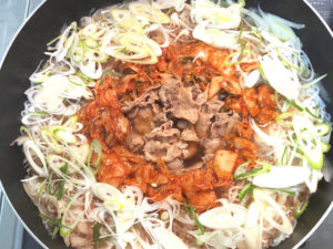 ![]() ⑥豚肉の周りにキムチ、斜め薄切りにしたねぎも上に散らし、再び蓋をして、3~5分煮ます。 |