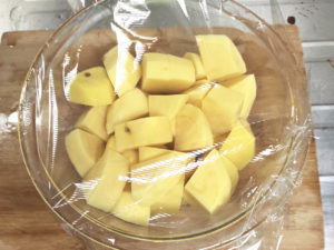 ![]() ②耐熱ボールにじゃがいもを入れ、ラップをして、レンジで8~10分ほど加熱します。 (竹串がすっと通る柔らかさまで) |