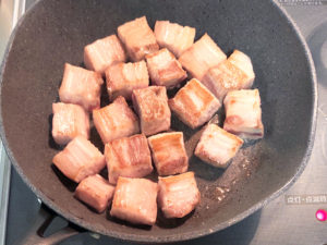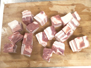 ![]() ③豚バラ肉も少し大きめの角切りにしましょう。 |