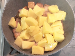 ![]() ⑥レンチンしたじゃがいもを戻し入れて、全体を混ぜて味を絡めます。 |