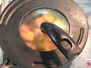![]() ⑦火を弱火にし、蓋をして、3~5分蒸し焼きにしましょう。 (豚肉にはしっかりと火を通してください。) |