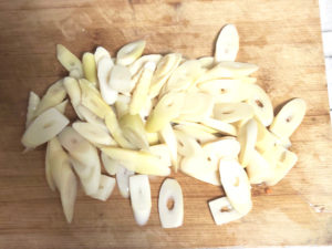 ![]() ②笹竹は、斜め薄切りにしましょう。 |