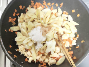 ![]() ③フライパンにサラダ油大1(分量外)を引き、鶏肉と人参を炒めます。 |