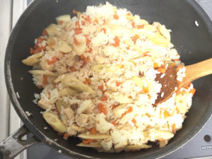 ![]() ⑥温かいご飯を一気に投入し、木べらで切るように混ぜます。 |