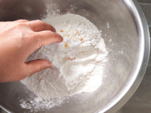 ![]() ①ボールに白玉粉、バニラオイル、砂糖を加えて、手でさっと混ぜます。 |