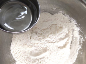 ![]() ②水を少しずつ足しながら練り、耳たぶくらいの柔らかさになったら、ひとまとまりにしましょう。 |