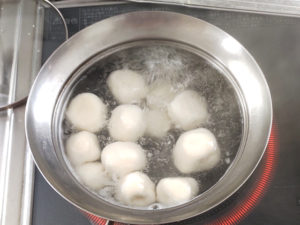 ![]() ④小鍋にお湯を沸かして、団子をゆで、浮いて来たら、さらに3分ほどゆでて、しっかりと火を通しましょう。 |