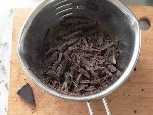 ![]() ⑤ゆでている間に、チョコを細かく均一に刻み、ひとかけら残して、湯せん用のボールに入れておきます。 |