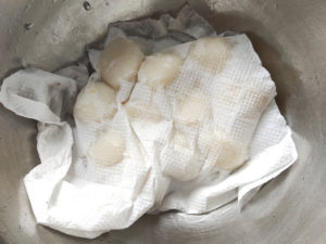 白玉団子の水分をしっかりと拭き取るのがポイントです。