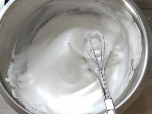 ![]() ①卵黄と卵白を別々のボールに入れます。 ②卵白に砂糖を一つまみ加えて泡立て始め、途中二回に分けて砂糖を加え、ピンと角が立つまで泡だててメレンゲを作りましょう。 |