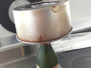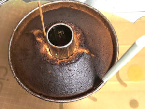 ![]() ⑪ケーキが焼けたら、すぐに逆さにして、瓶などに挿し、このまま2時間以上放置します。 |