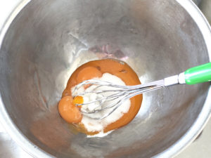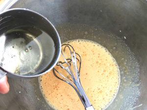 ![]() ③卵黄のボールに砂糖を加えて泡立て、白っぽくとろりとするまで泡だてましょう。 |