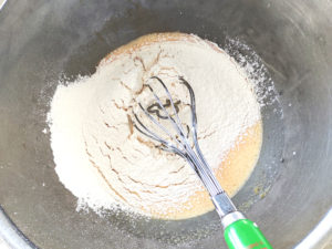 ![]() ④牛乳を少しずつ加え、その都度よく混ぜます。 |