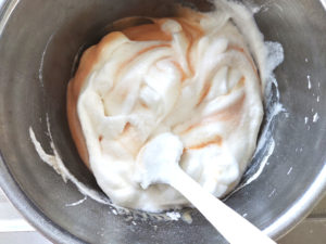 ![]() ⑧卵黄のボールにメレンゲを全量加え、ゴムべらに持ち替えて、さっくりと練らないように混ぜましょう。 |