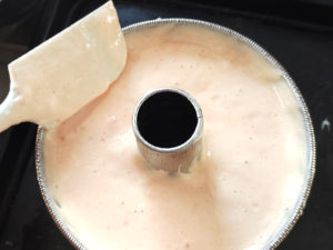![]() ⑨生地を流し入れ、型ごととんとん落として空気を軽く抜きます。 ⑩縁部分と筒部分に生地をなすりつけるようにして、焼きあがりを助けましょう。 |
